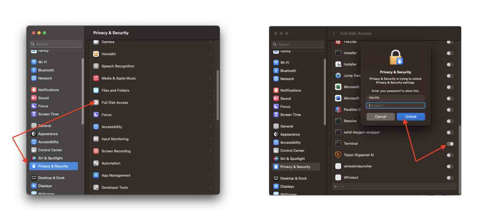 Bước 3: Cấp quyền cho Terminal theo hướng dẫn dưới đây: